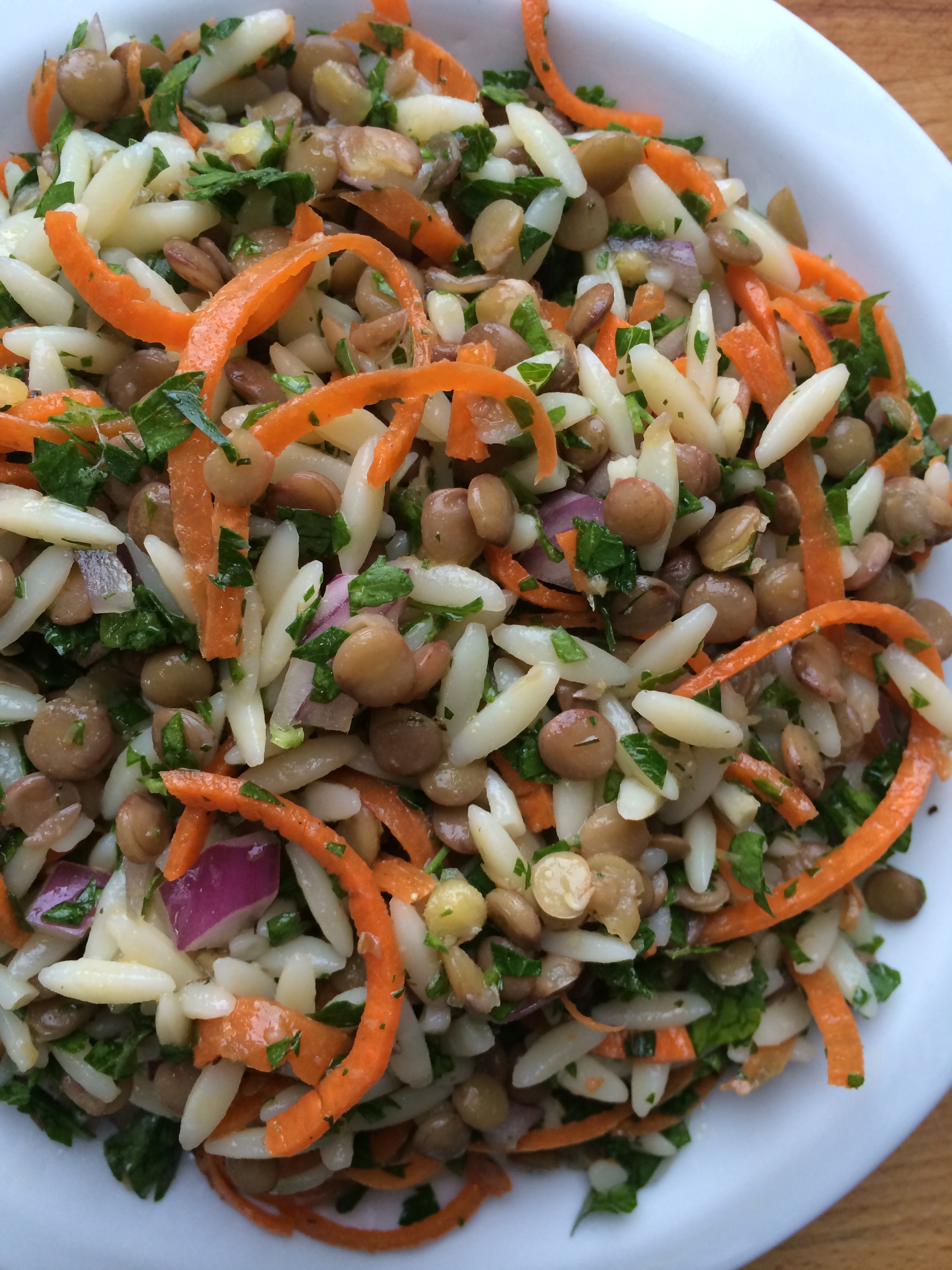 Combine cooled lentils, orzo, carrots, red onions, and parsley in a bowl.