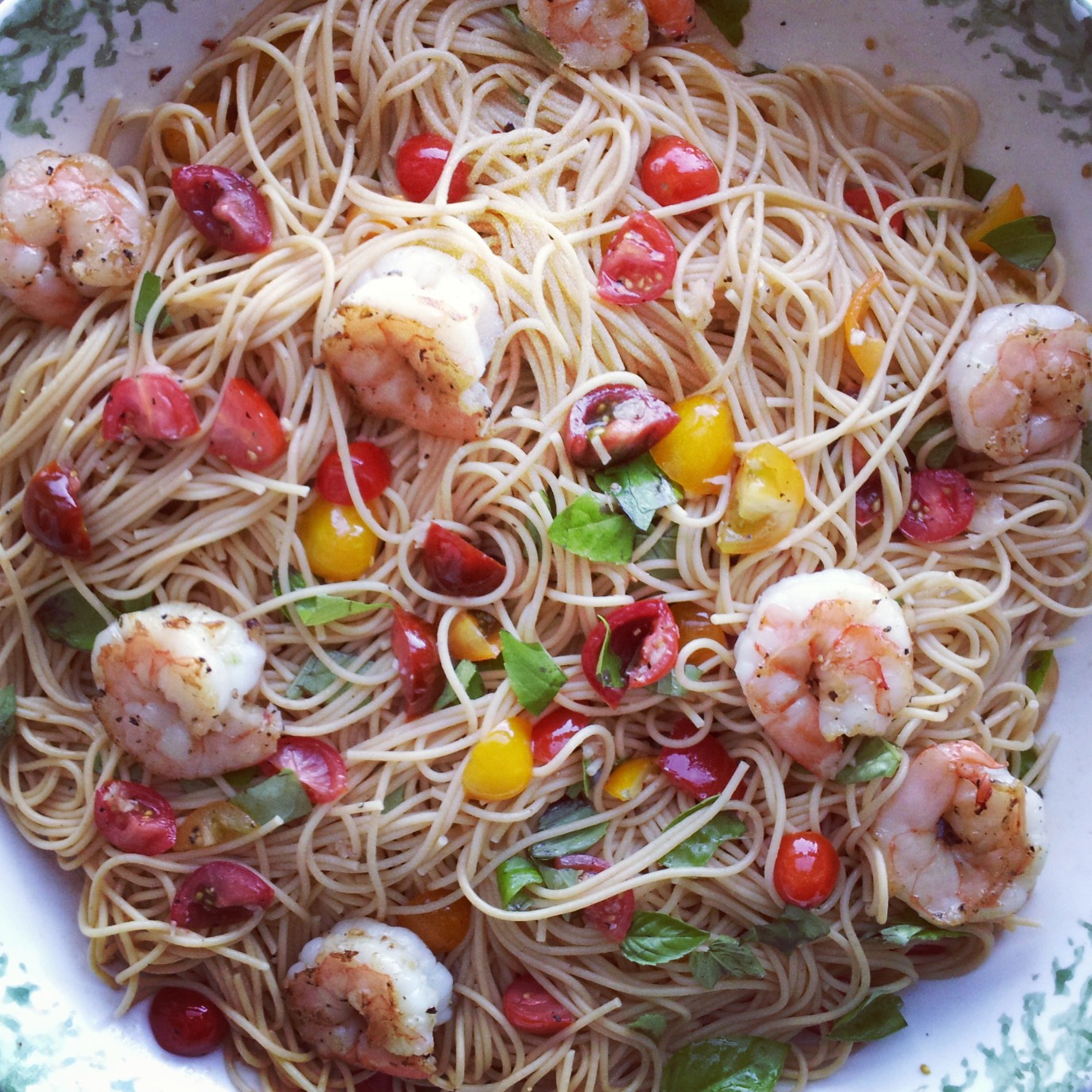 To warm pasta, add tomatoes, garlic, 1/4 cup olive oil, the reserved pasta water, crushed red pepper flakes, salt and pepper.  Toss to combine.  Add basil leaves, toss, top with reserved shrimp, and serve.  Enjoy with a crisp glass of Sauvignon Blanc.