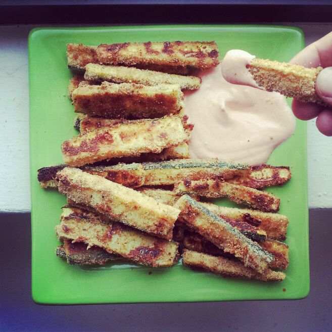 Why not combine one of my happy craving foods (french fries) with all this Zuk? It’s not a secret that french fries aren’t the healthiest, so I often make my own. To offset the unhealthiness, I’ll bake the fries instead of frying them. Now you see where I’m going with this recipe. The zucchini stays crisp and fresh, and the garlicky bread crumbs give it a nice crunchy coating. I paired these zucchini fries with a tangy Greek yogurt Sriracha dipping sauce. As my mom would say, “to die for!”