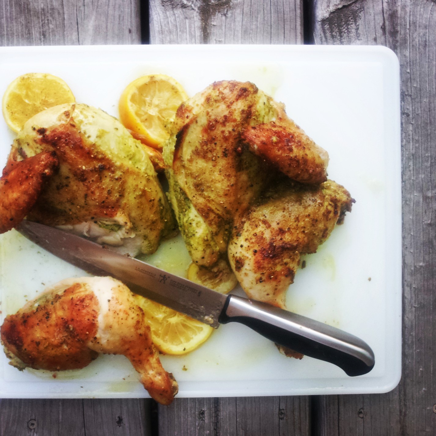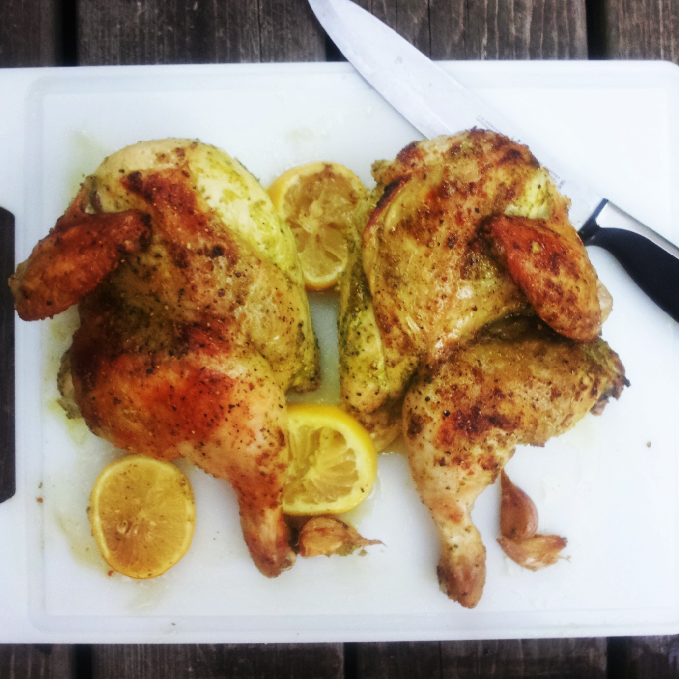 - 3 1/2 – 4 lb chicken, butterflied and split in half (breastbone removed)