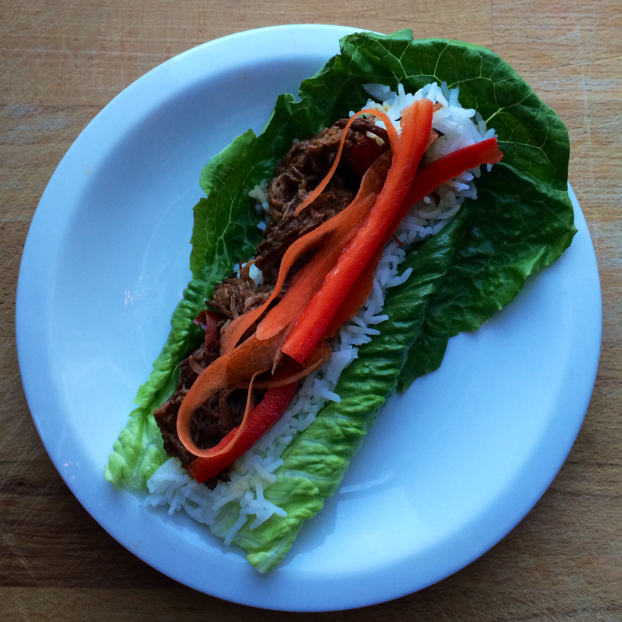 Assemble lettuce wraps. I like to make mine as follows: 1 lettuce leaf, 2 tbsp white jasmine rice, 2 tbsp Korean beef, sliced red bell pepper, shaved carrots, a few scallions, few sesame seeds, and a drizzle of hot sauce. Enjoy!