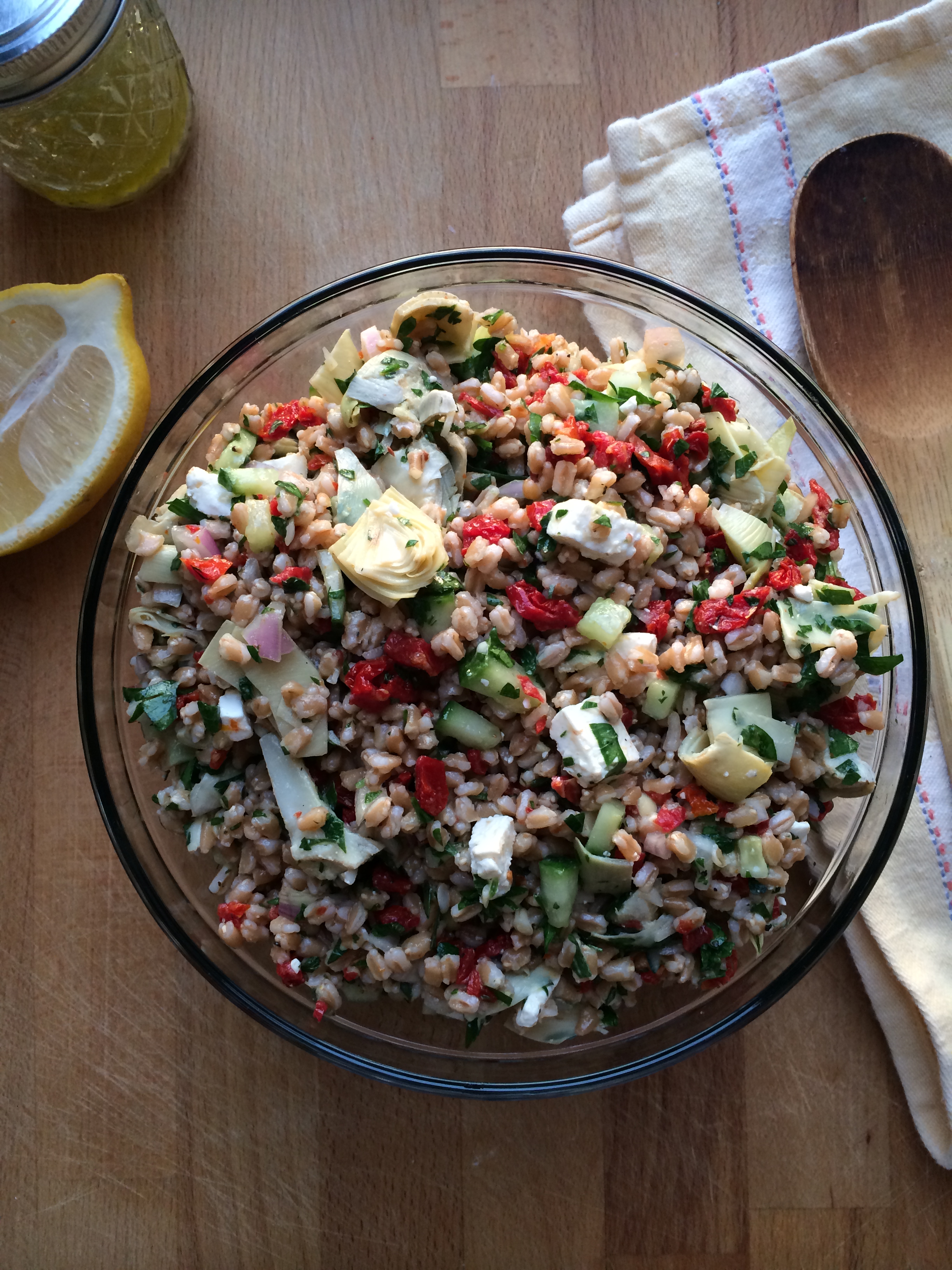 Once farro has cooled, transfer to a serving bowl and add cucumber, shallot, sun-dried tomatoes, artichoke hearts, and parsley. Toss with the salad dressing (start with 1/2 of the prepared dressing and add more to suit your taste). Add feta cheese, toss again. Serve at room temperature or chilled.