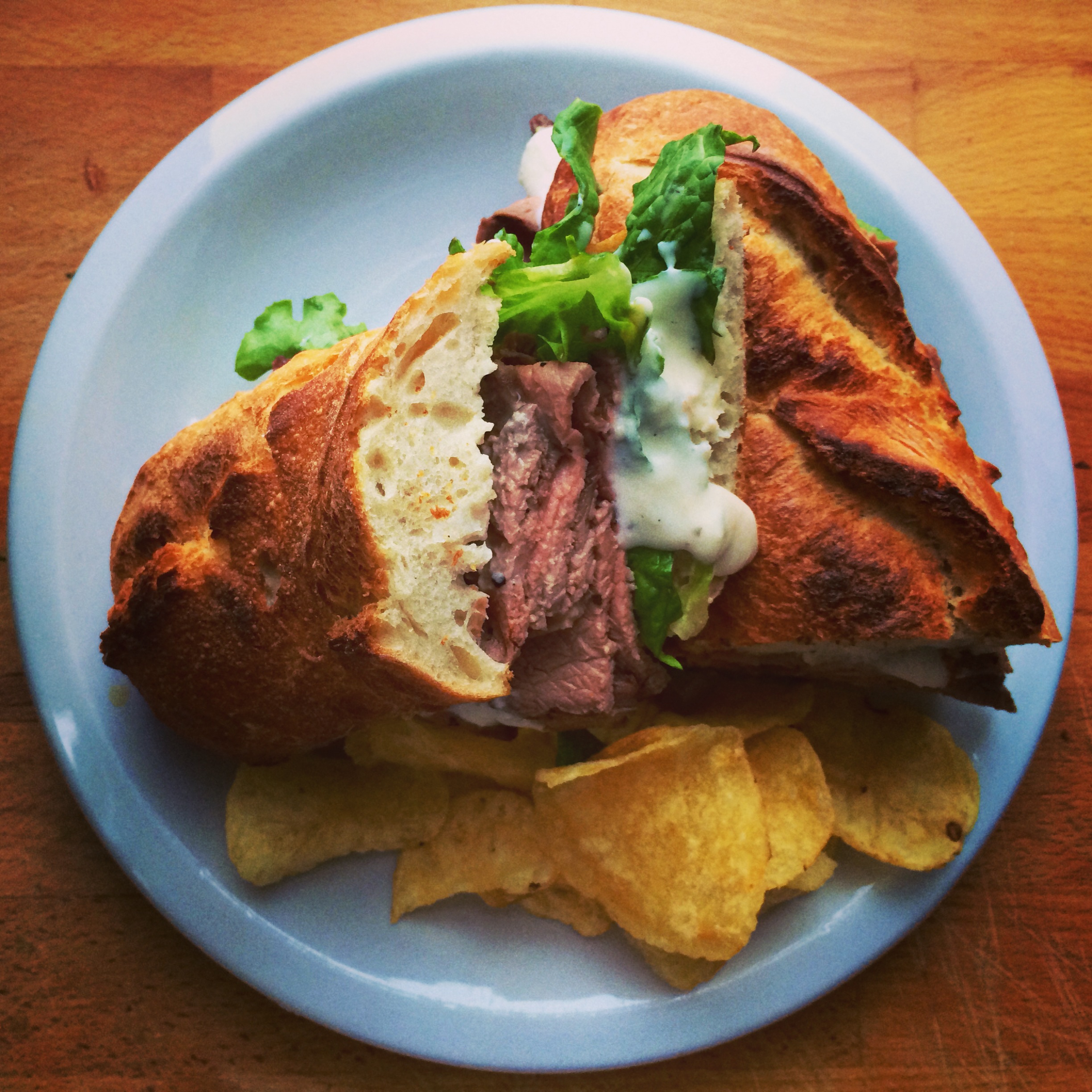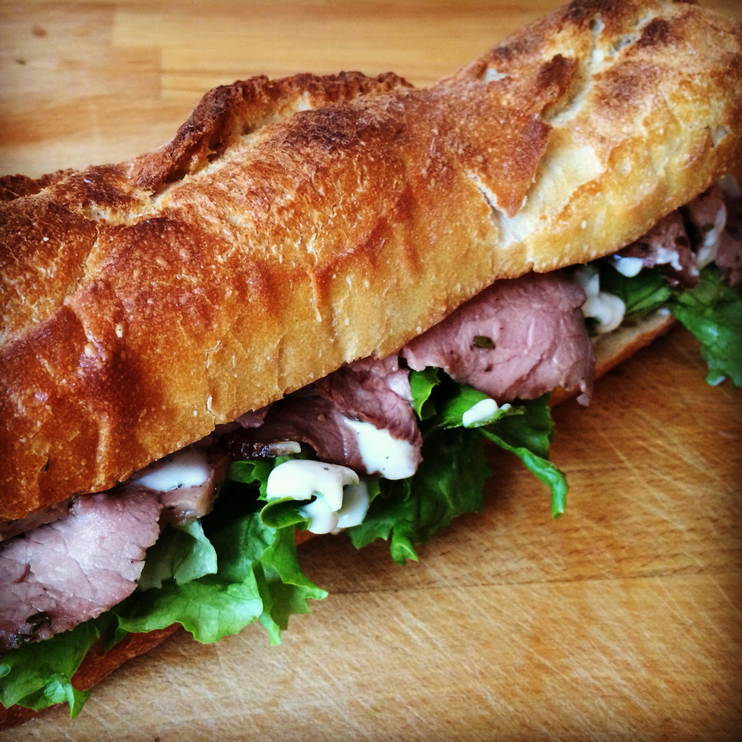 Toast demi baguette, or your bread of choice. Slather bread with horseradish cream sauce, top with crisp lettuce, and thin slices of Rosemary and Garlic Roast Beef. Serve with extra horseradish cream sauce on side.