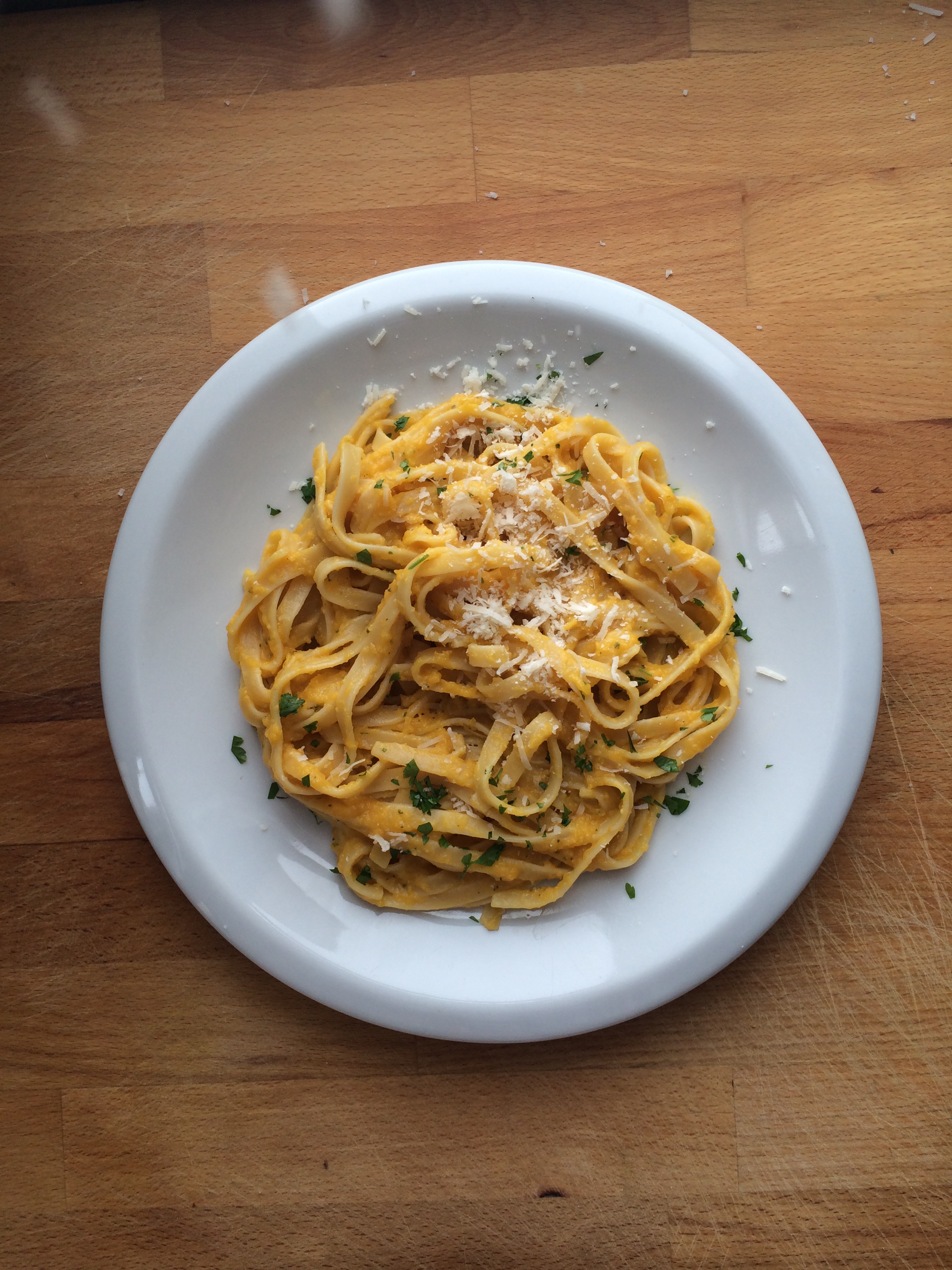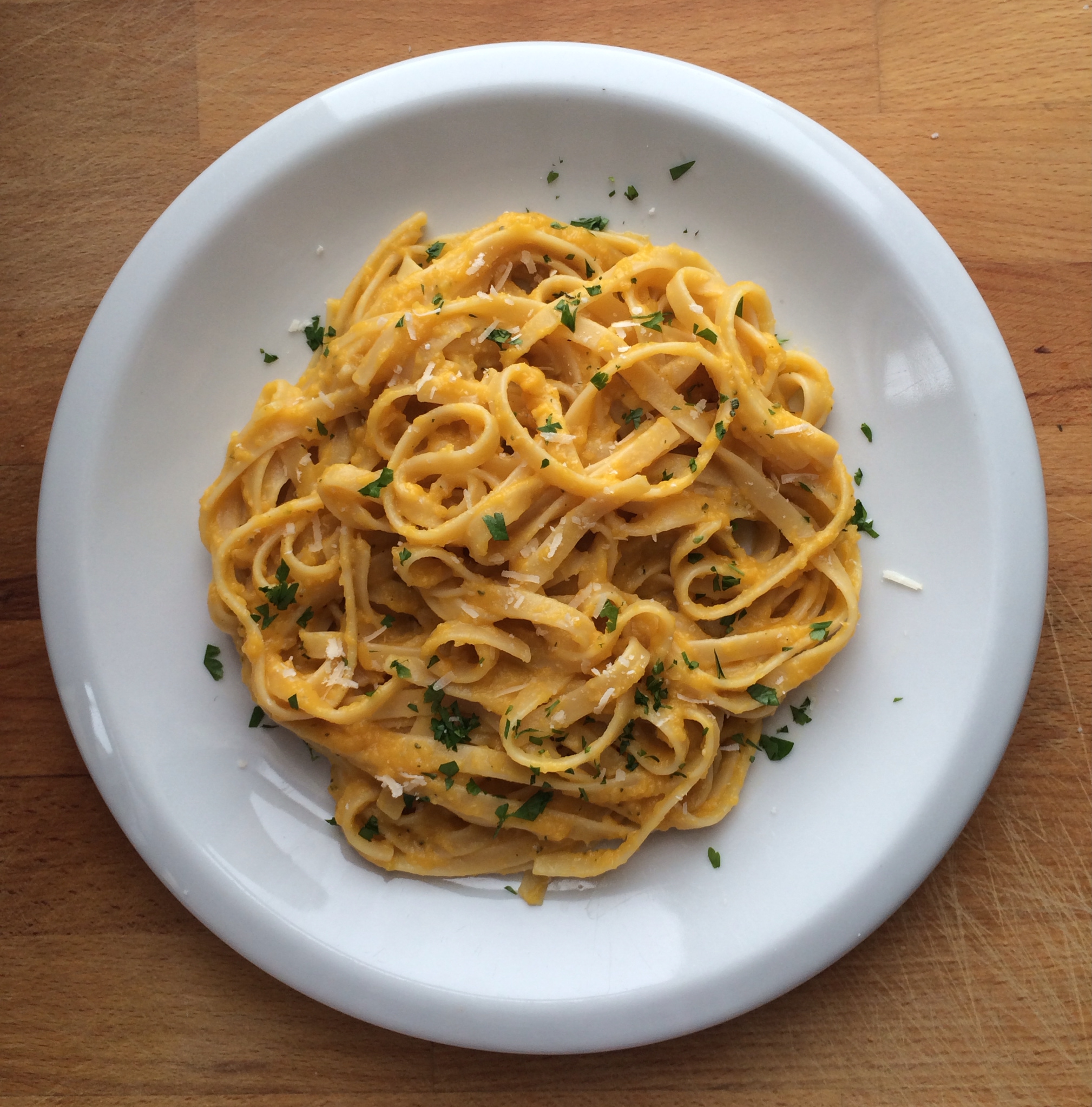 The natural smoothness of the pureed butternut squash gives this sauce a velvety, creamy texture. No actual cream required. Butter, olive oil, shallot, garlic, sage, and red pepper flakes cook together to make a wonderful flavor base for the roasted squash puree. High quality parmesan cheese is mandatory. Toss with your favorite pasta; long, short, thick, thin, whole wheat, gulten free, low carb … all good options. Top with extra parmesan cheese and fresh parsley, and you have yourself one flavorful and highly satisfying bowl of pasta. Healthy and beautiful, I might add.
