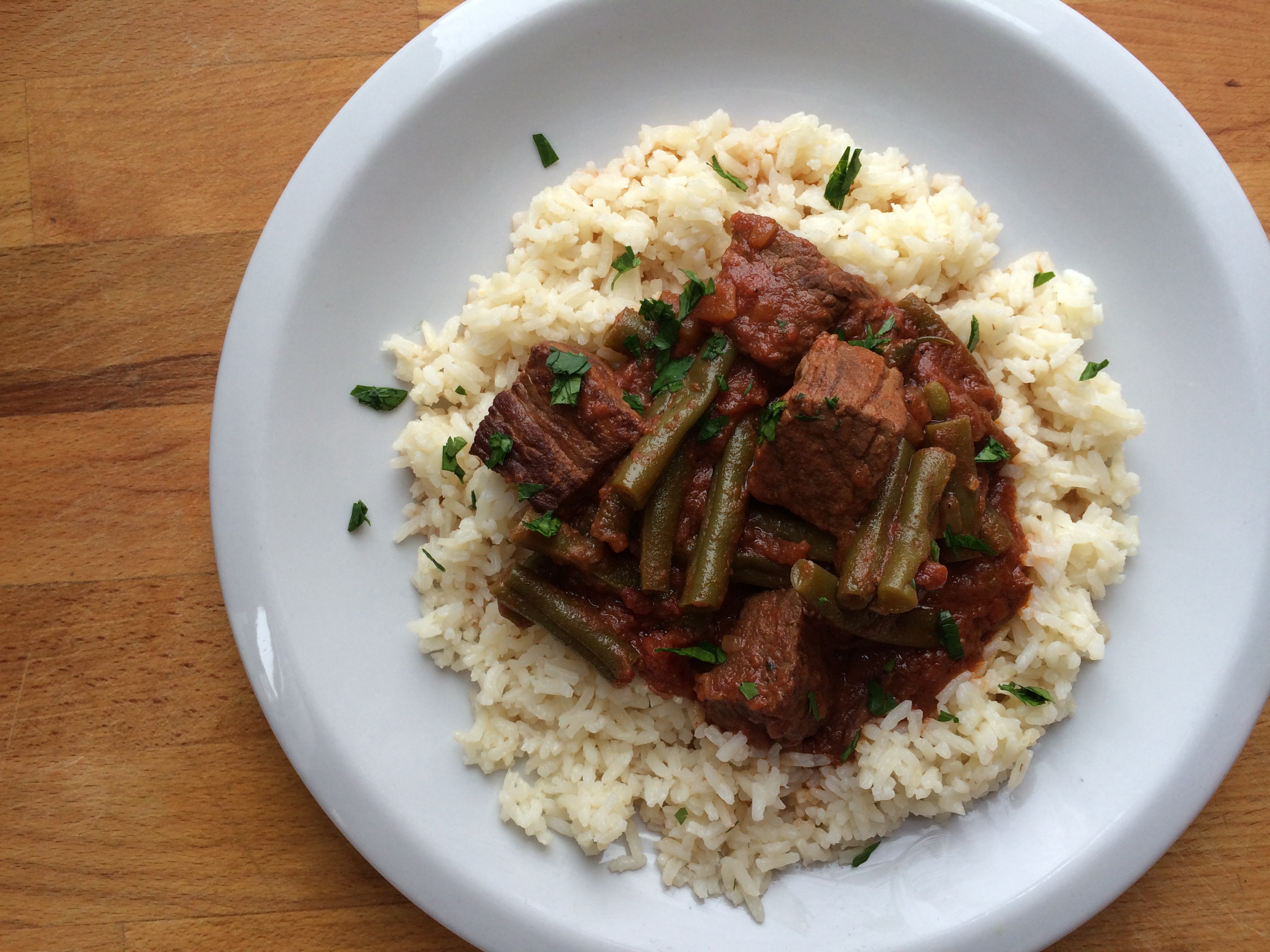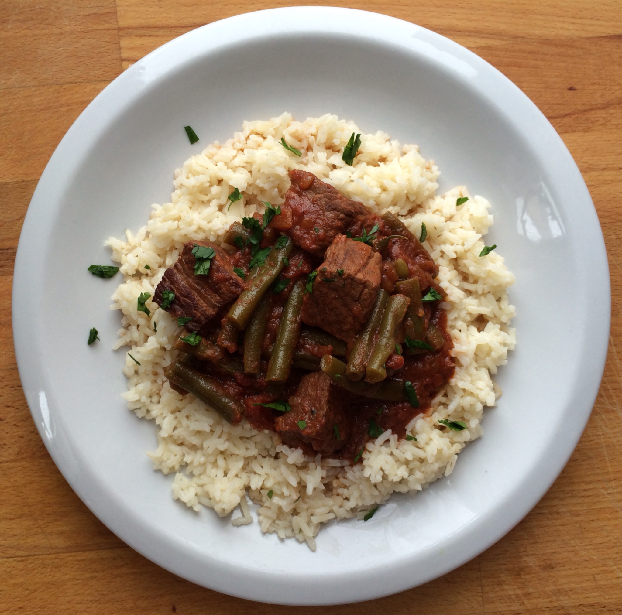 A savory combination of either beef or lamb, green beans, onions, garlic, tomatoes, cinnamon, salt, and pepper. The cinnamon brings a lovely warmth to the dish. It really makes it. An unmistakable comforting smell will engulf your kitchen.