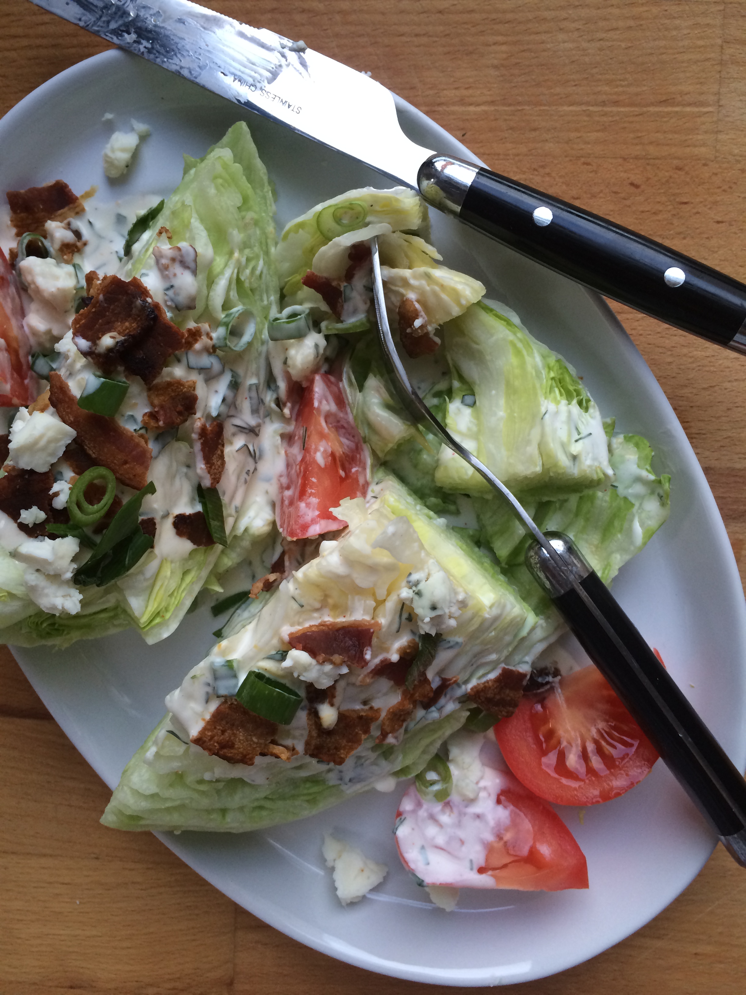 A hunk of super crisp iceberg lettuce soaked in creamy homemade ranch dressing and topped with crispy bacon, scallions, tomatoes, crumbly blue cheese, and freshly cracked black pepper. It may not be the healthiest salad, but it is damn delicious. It’s also damn handsome, if I do say so myself … (and I do). Serve as a main course with a chunk of crusty bread, or along side a grilled porterhouse. Perfection.