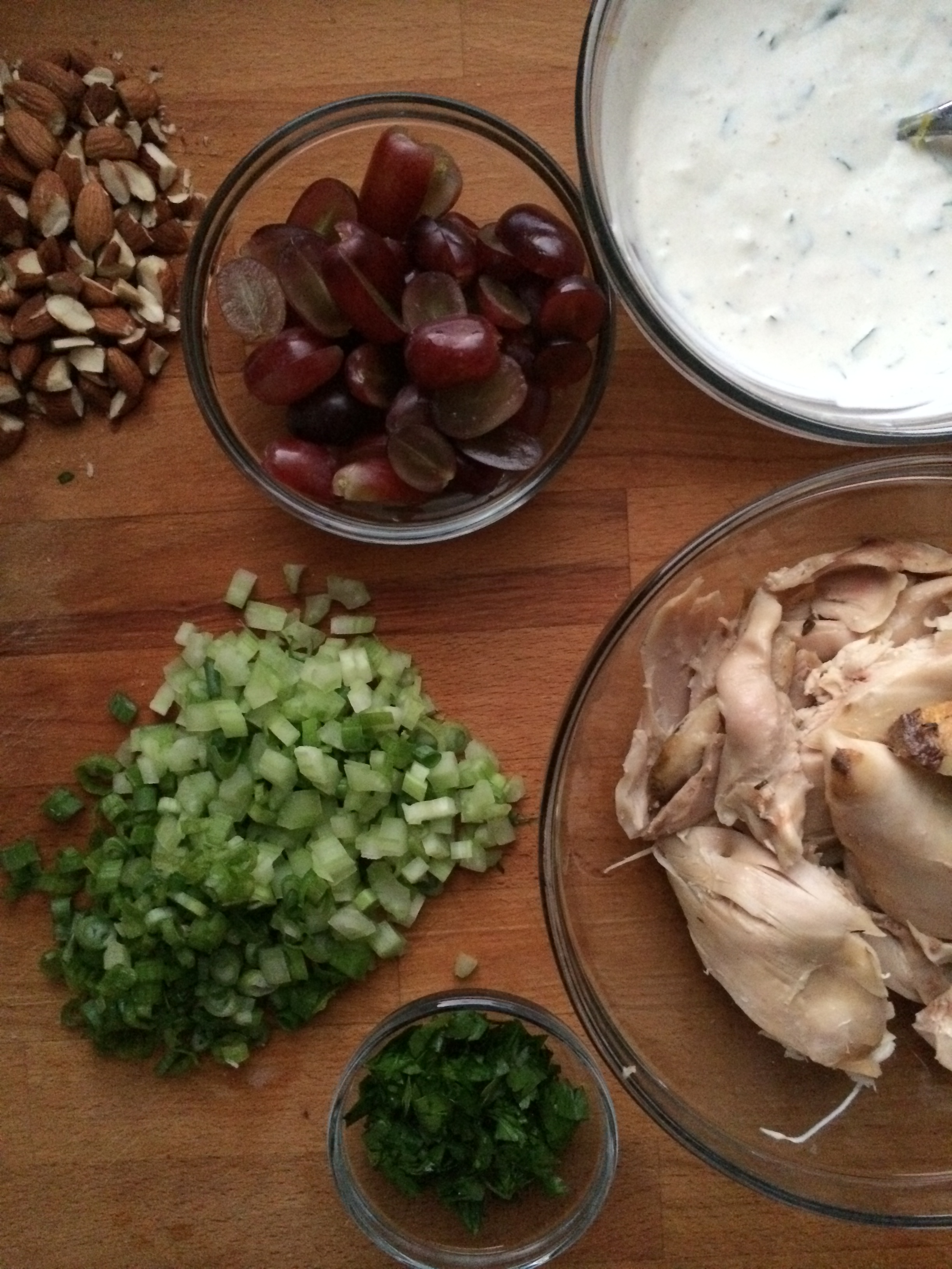 Pick up a rotisserie chicken from the market, or use leftover chicken. Either option works well. I like the substantial crunch the celery and almonds provide. I like the little kick of sweetness from the grapes. And I love the tarragon. Tarragon is a must! Preparing chicken salad “the classic way”… that’s how I roll.