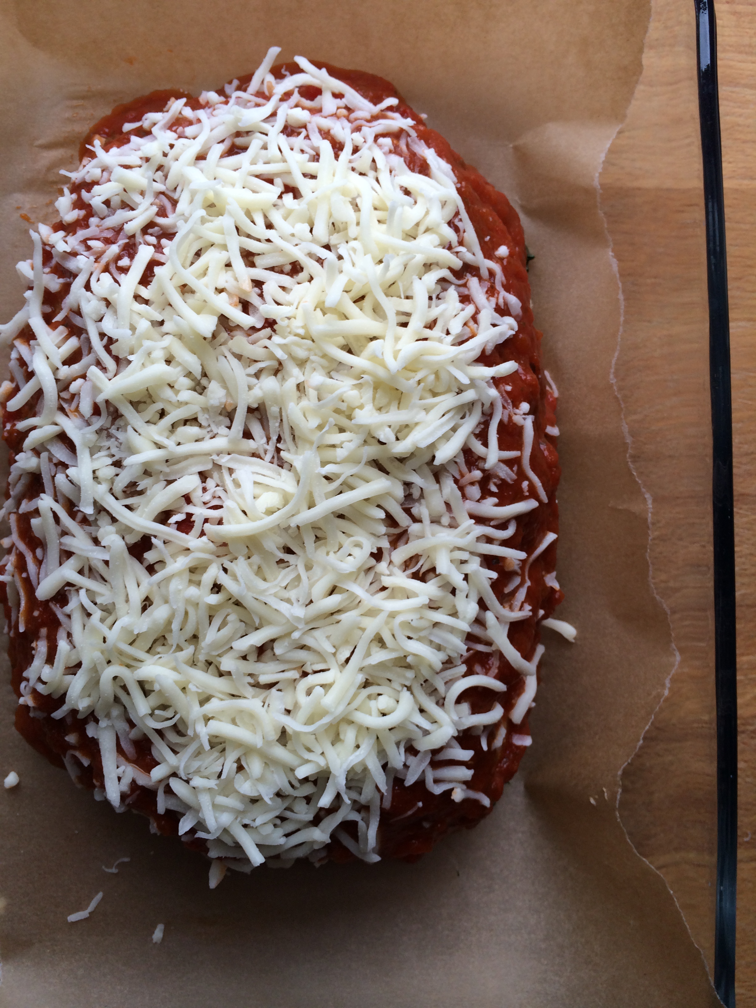 Line a baking dish with parchment paper. Roughly form the turkey mixture into a 3 inch thick loaf. Pour the marinara sauce over the loaf and top with mozzarella cheese.
