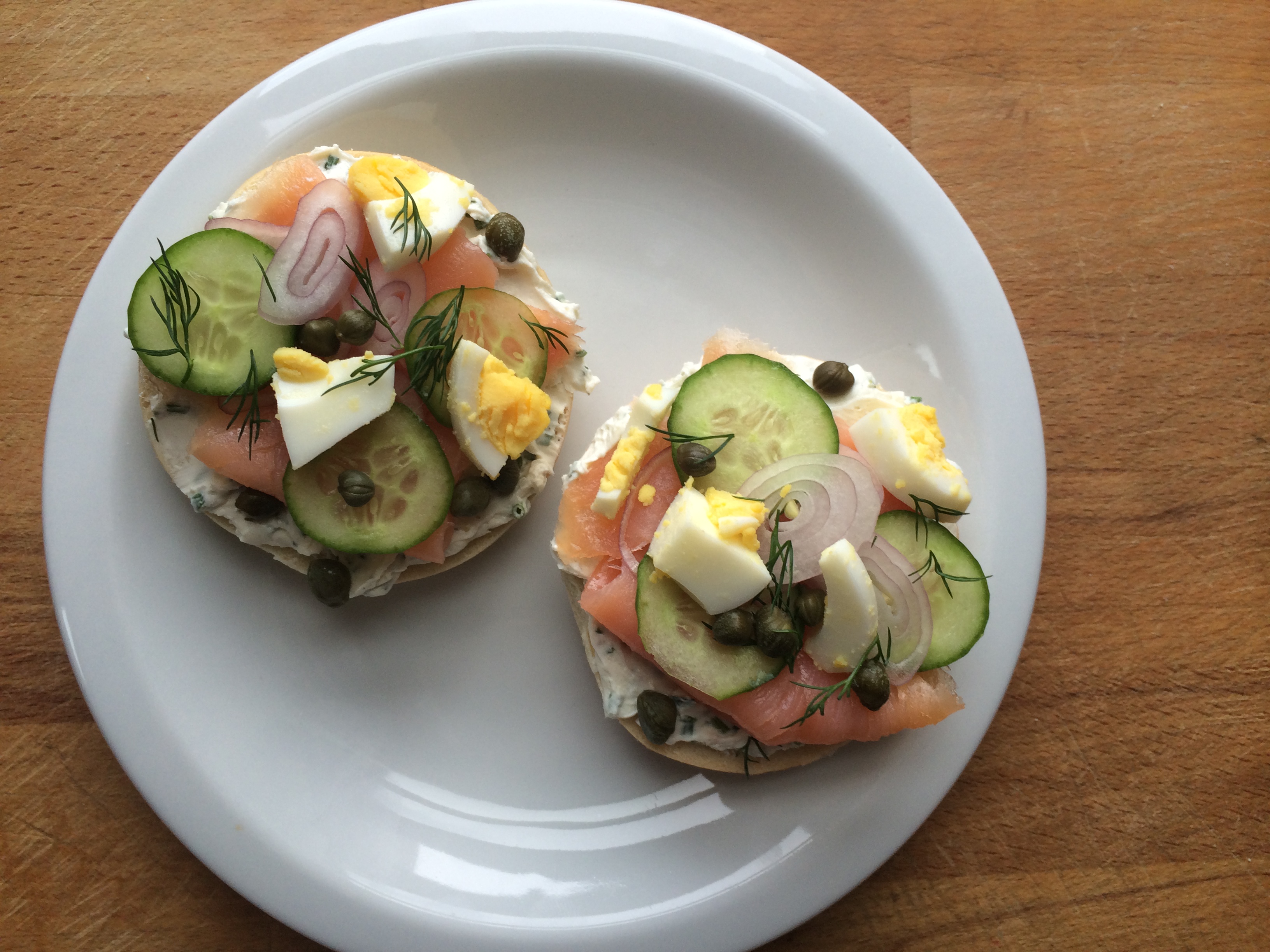 Toast bagel (or leave un-toasted if you prefer). Smear with cream cheese spread. Top with desired amount of smoked salmon, shallot, cucumber, egg, capers and dill. Squeeze with fresh lemon juice and finish with freshly cracked black pepper. Serve open face.