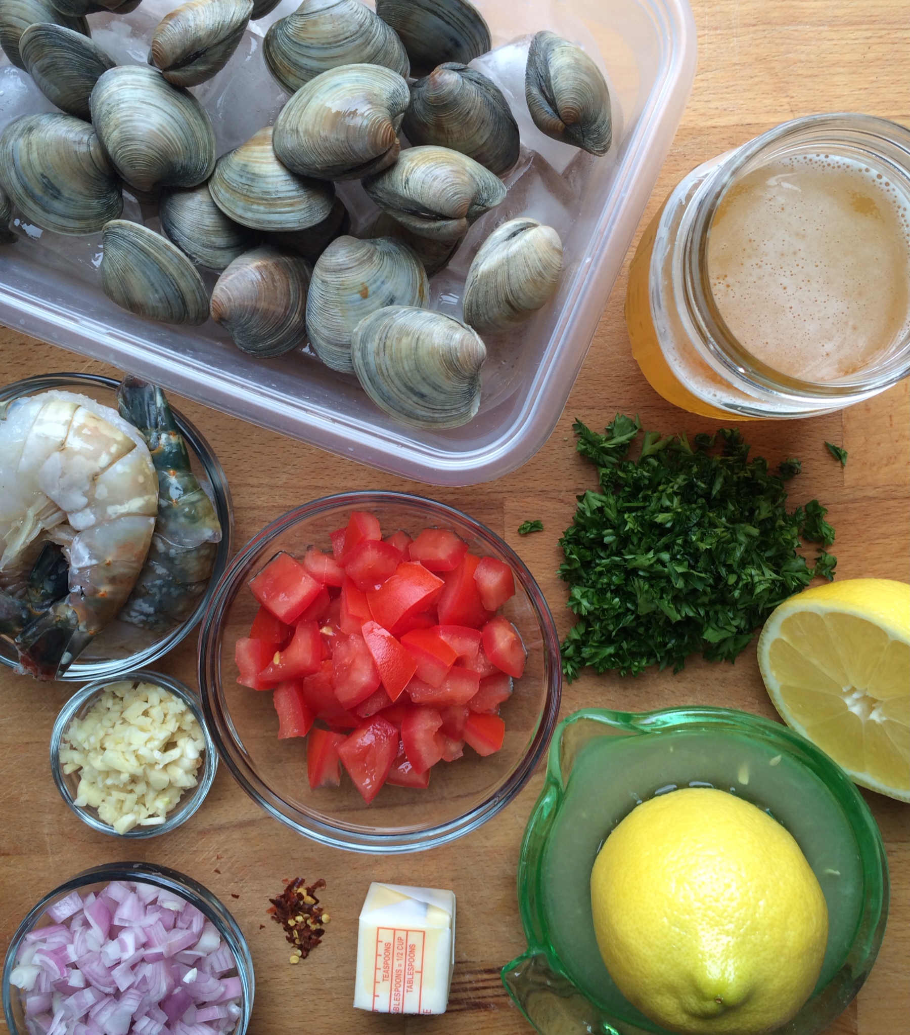 My favorite way to cook shellfish is in a flavorful broth. A mouthwatering concoction of beer, shrimp shells (you read that correctly, this bad boy has shrimp infused broth!), lemon, shallot, butter, tomatoes, and fresh herbs. I mean, half the fun of steaming shellfish is dunking copious amounts of toasted bread into that liquid gold broth. Don’t forget the toasted bread!