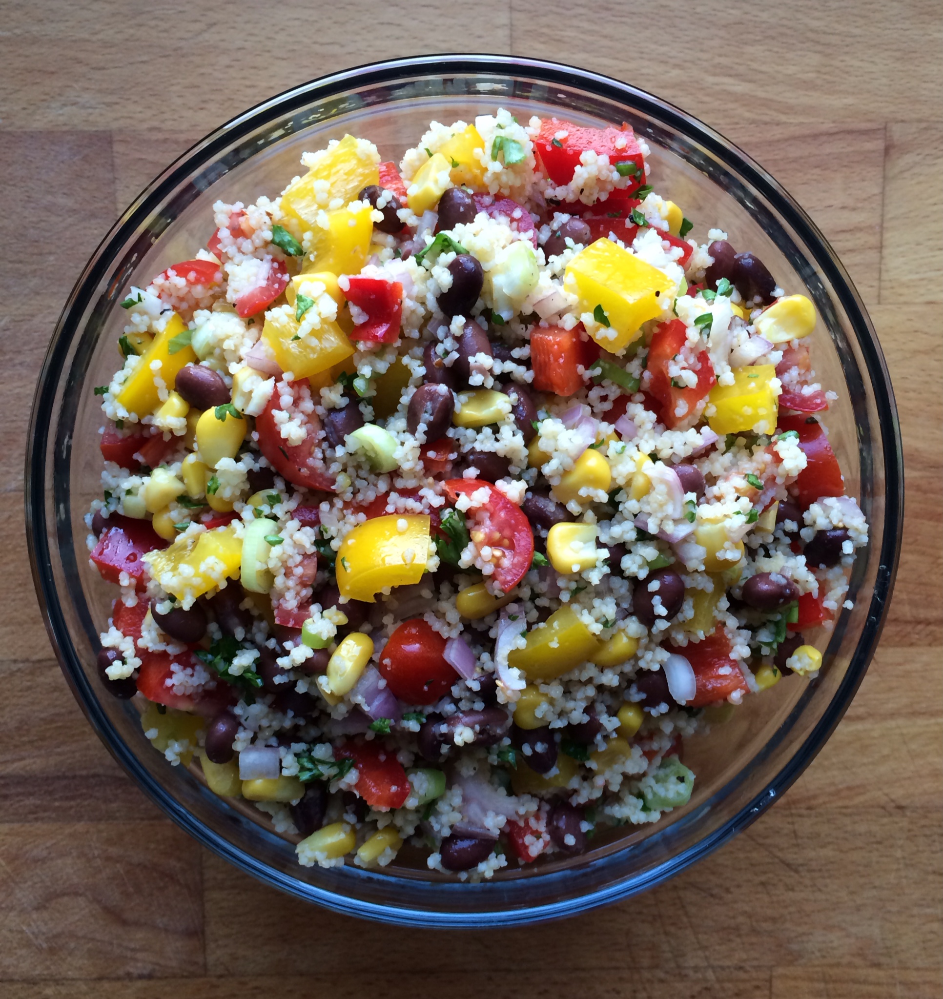Combine cooked and cooled couscous, black beans, corn, shallot, cherry tomatoes, bell pepper, and cilantro in a large bowl. Toss to combine.