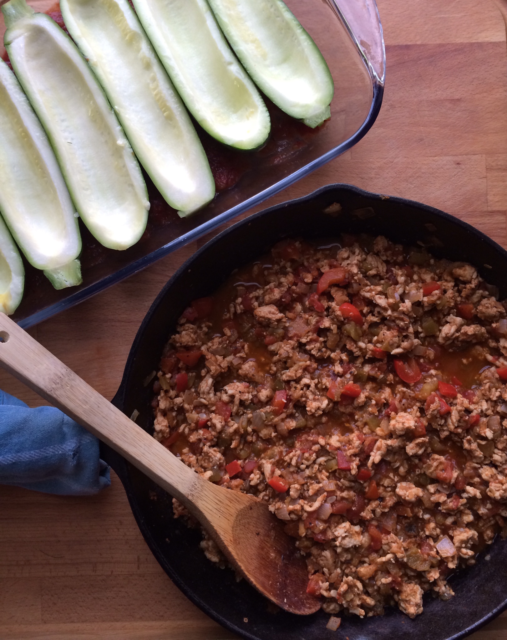 - Heat a large skillet over medium-high heat and add the olive oil. Once hot, add onion and red bell pepper. Cook for 5 minutes, stirring frequently. Add garlic and cook for an additional minute. Add ground turkey and cook for 5 minutes, breaking turkey into bite sized pieces. Once turkey is browned, add reserved zucchini flesh, tomatoes, lime juice, cilantro, greed chilies, taco seasoning, cumin, dried oregano, smoked paprika, salt, and freshly cracked black pepper. Bring to a boil, then reduce heat to low and simmer uncovered for 20 minutes until most of the liquid has evaporated. Allow mixture to cool slightly.