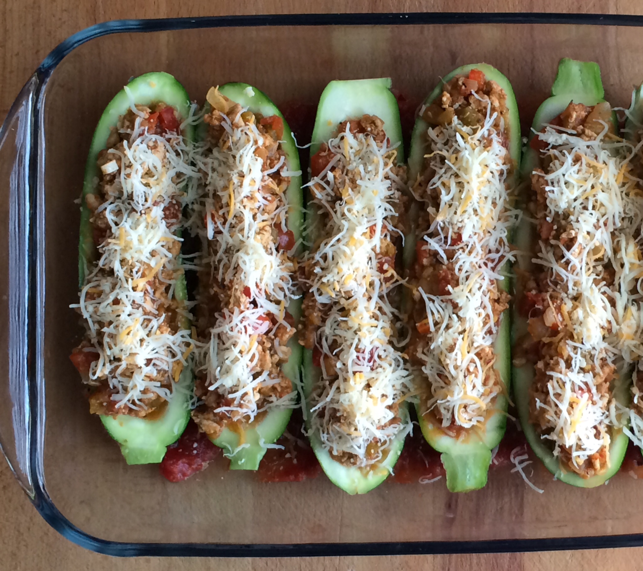 Recipe inspired by Skinnytaste’s Taco Stuffed Zucchini Boats