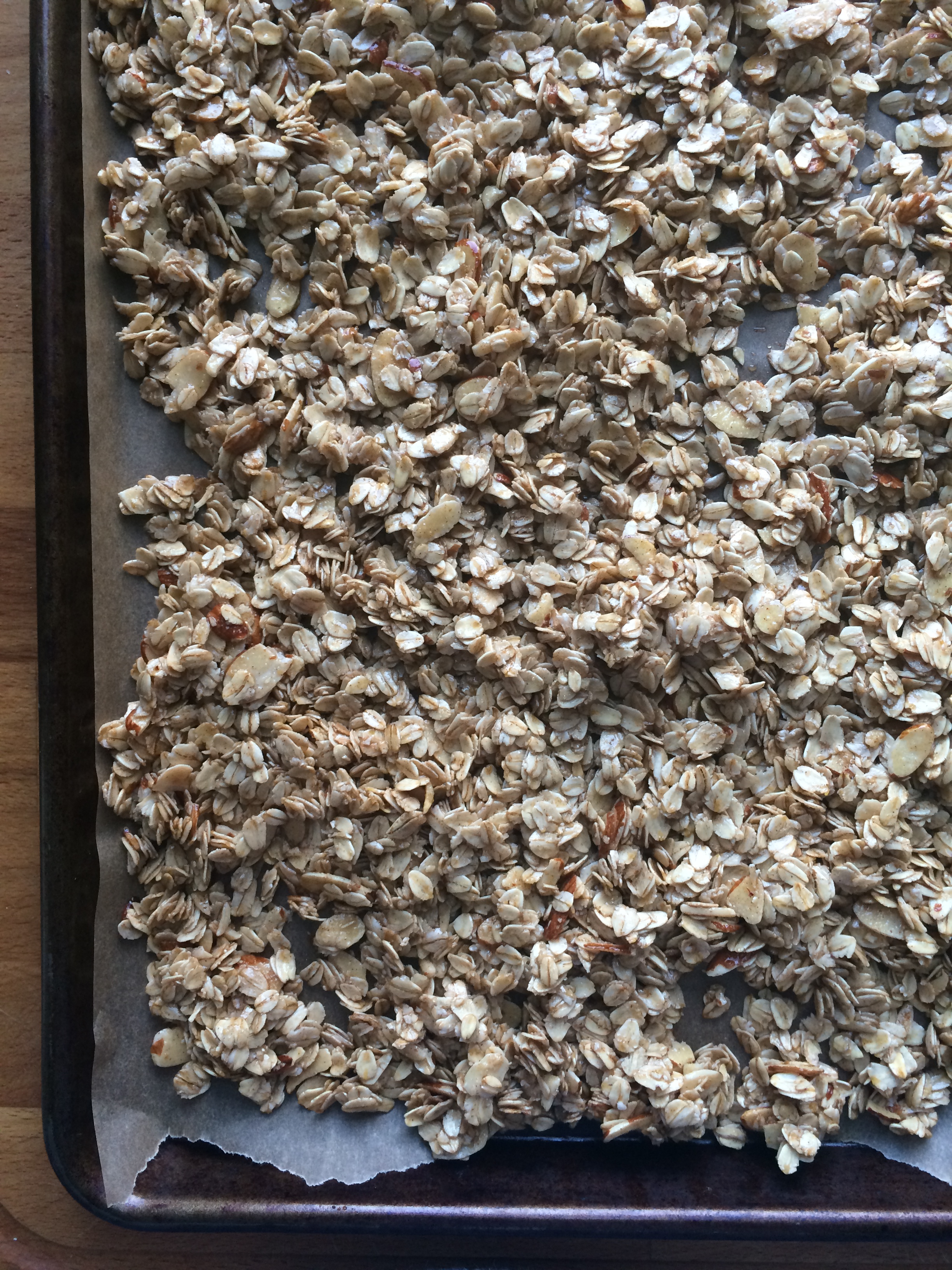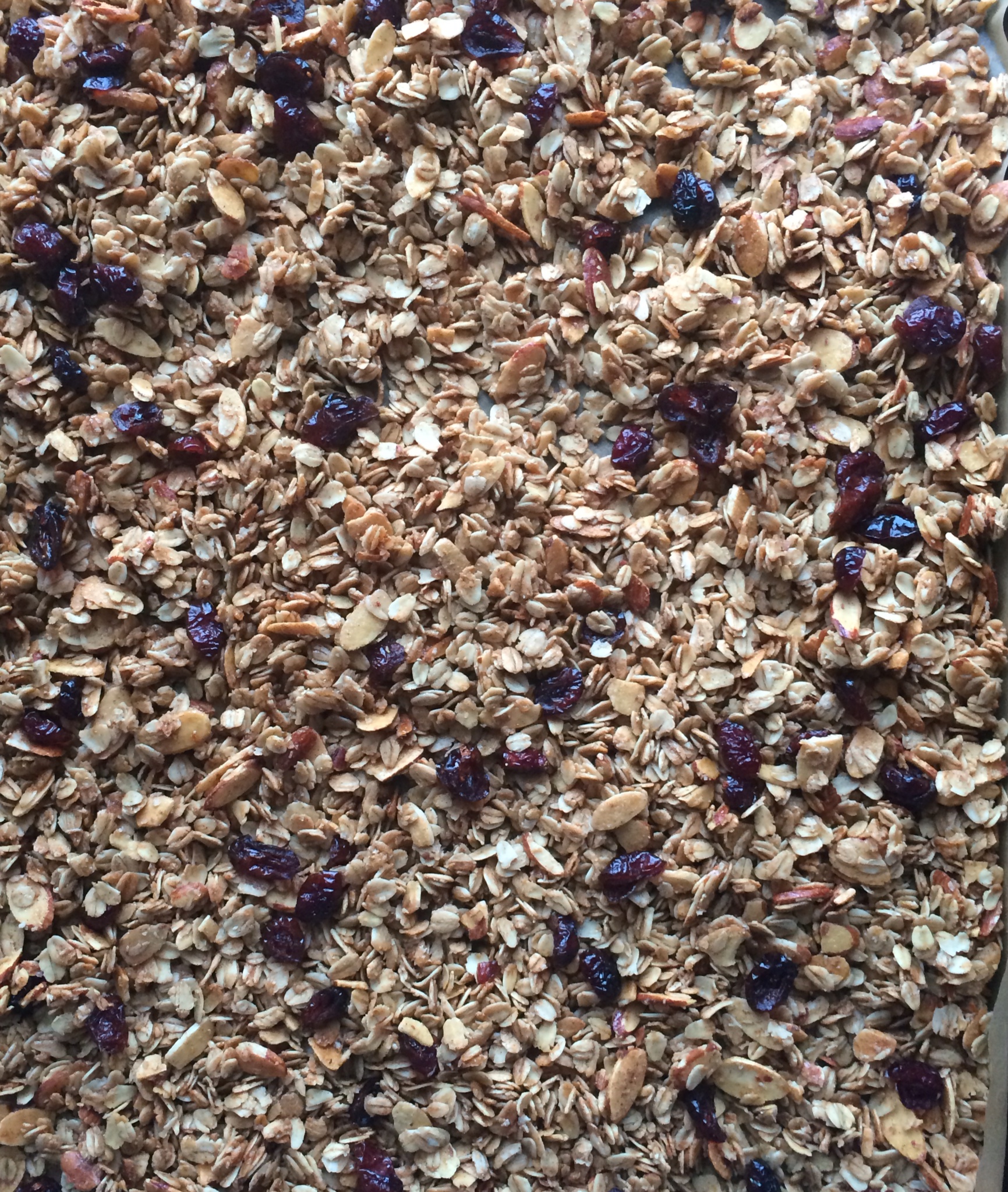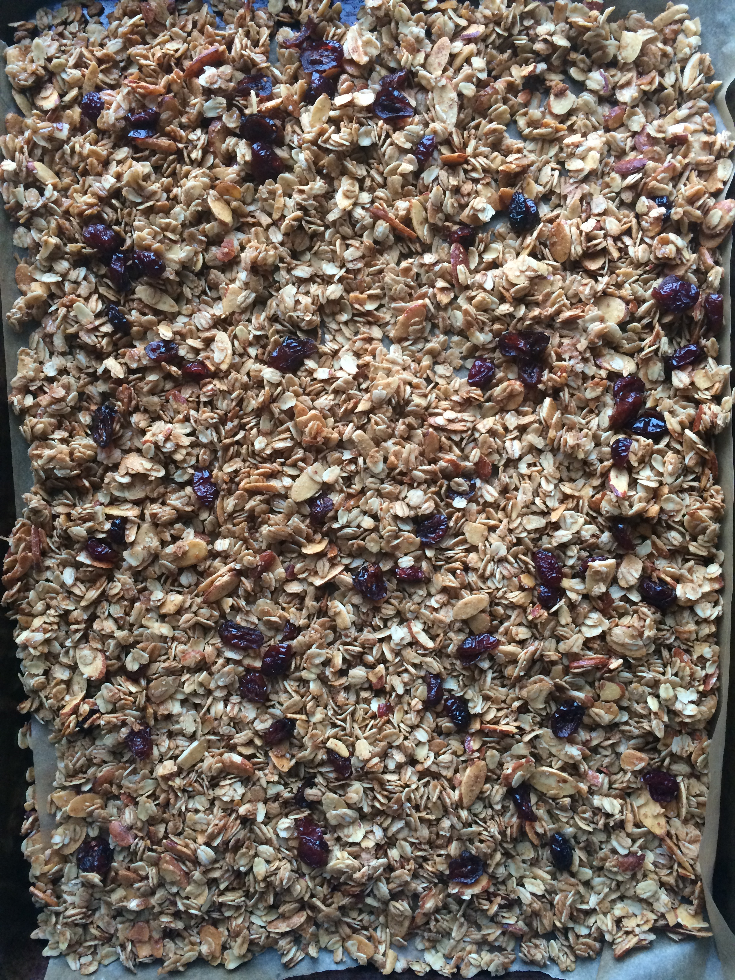 Oats, almonds, cinnamon and a pinch of salt are combined then tossed with coconut oil, maple syrup, brown sugar, vanilla extract, and almond extract. Lastly, a simple baking process and addition of dried cranberries. The result is a perfectly crunchy, “un-sweet”, sweetened granola with a subtle maple flavor and a less-subtle nutty almond flavor.