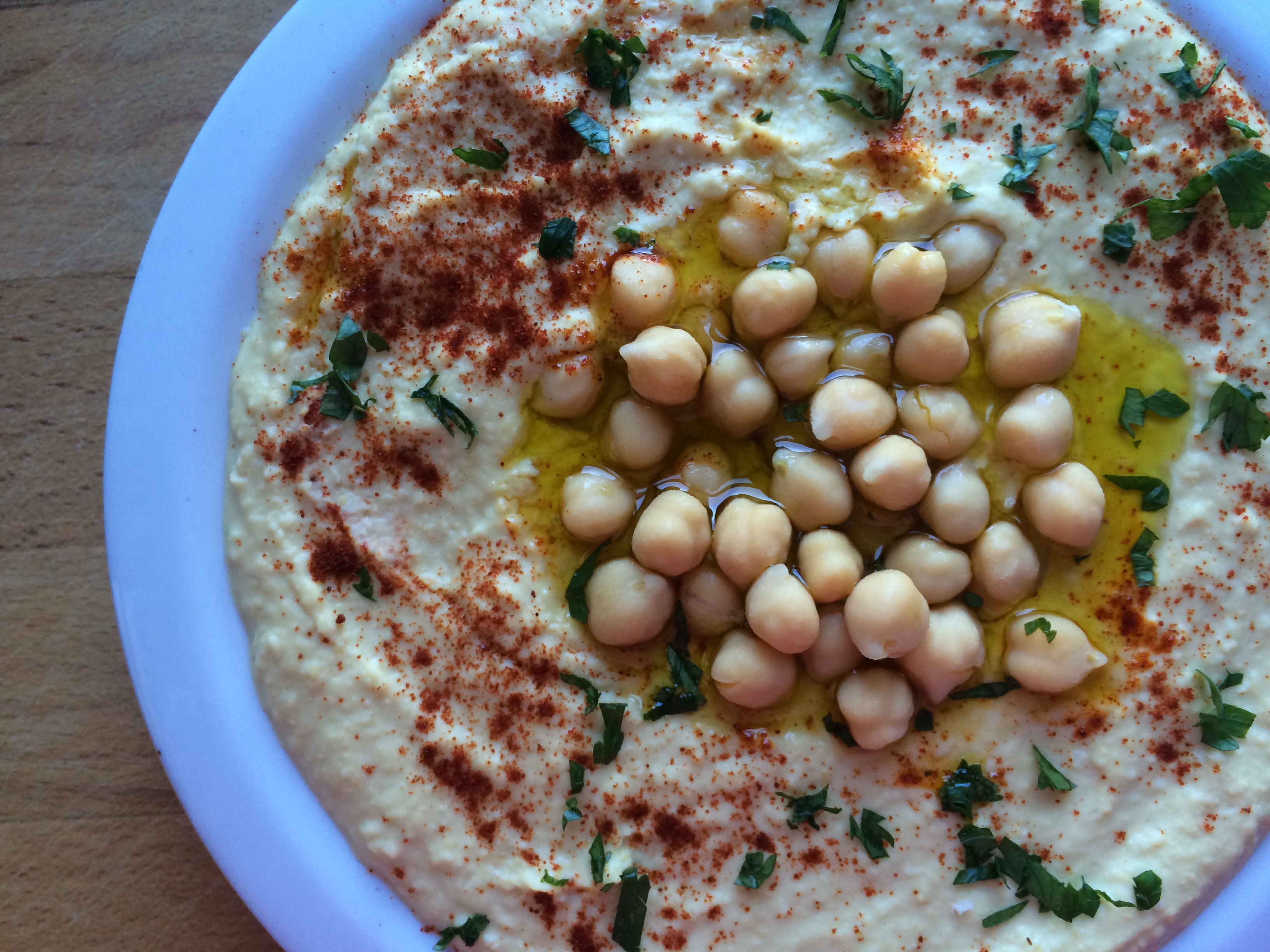 - Spread hummus on a serving plate. Drizzle with olive oil, top with reserved garbanzo beans, and sprinkle with smoked paprika and fresh parsley.