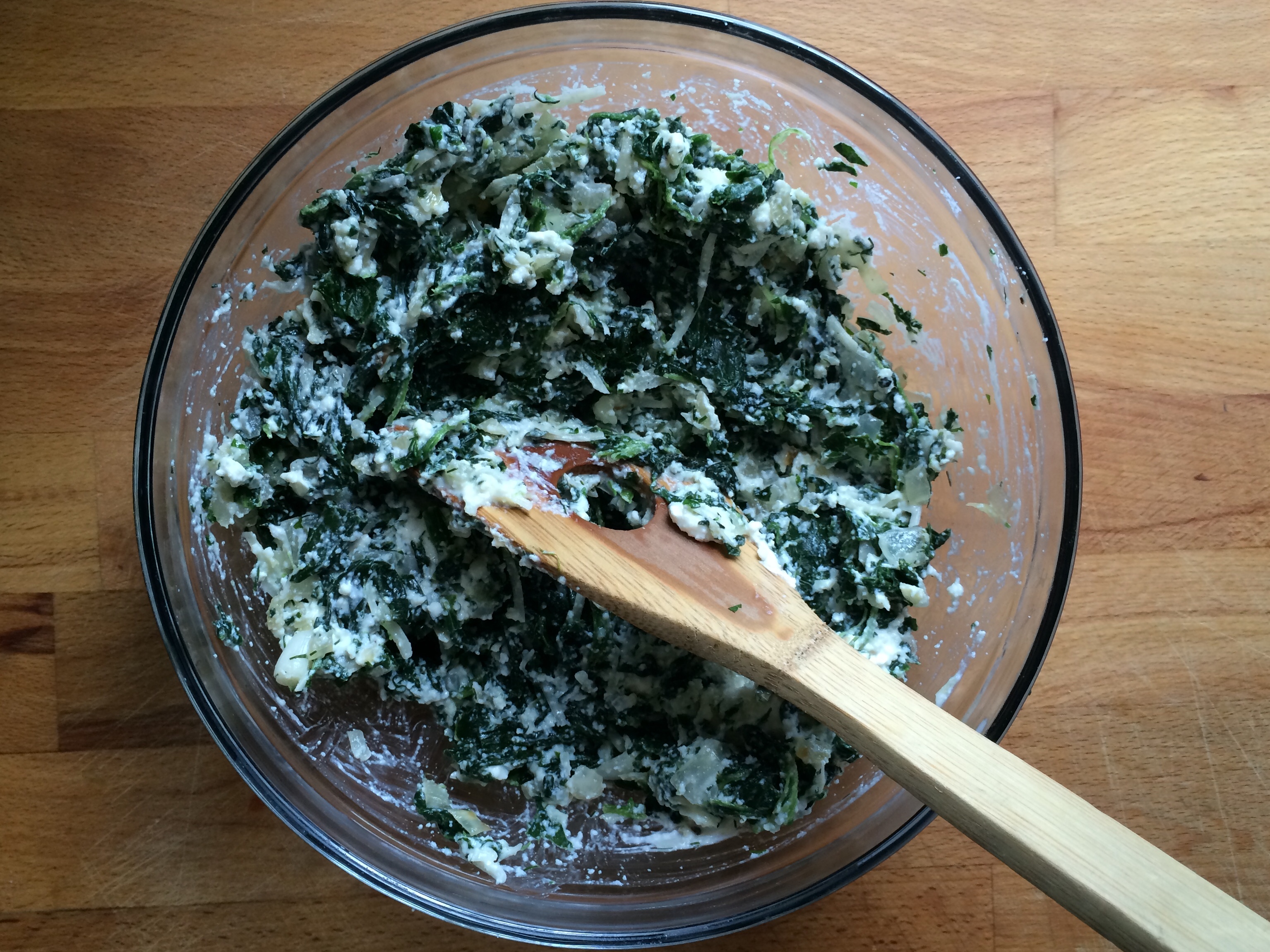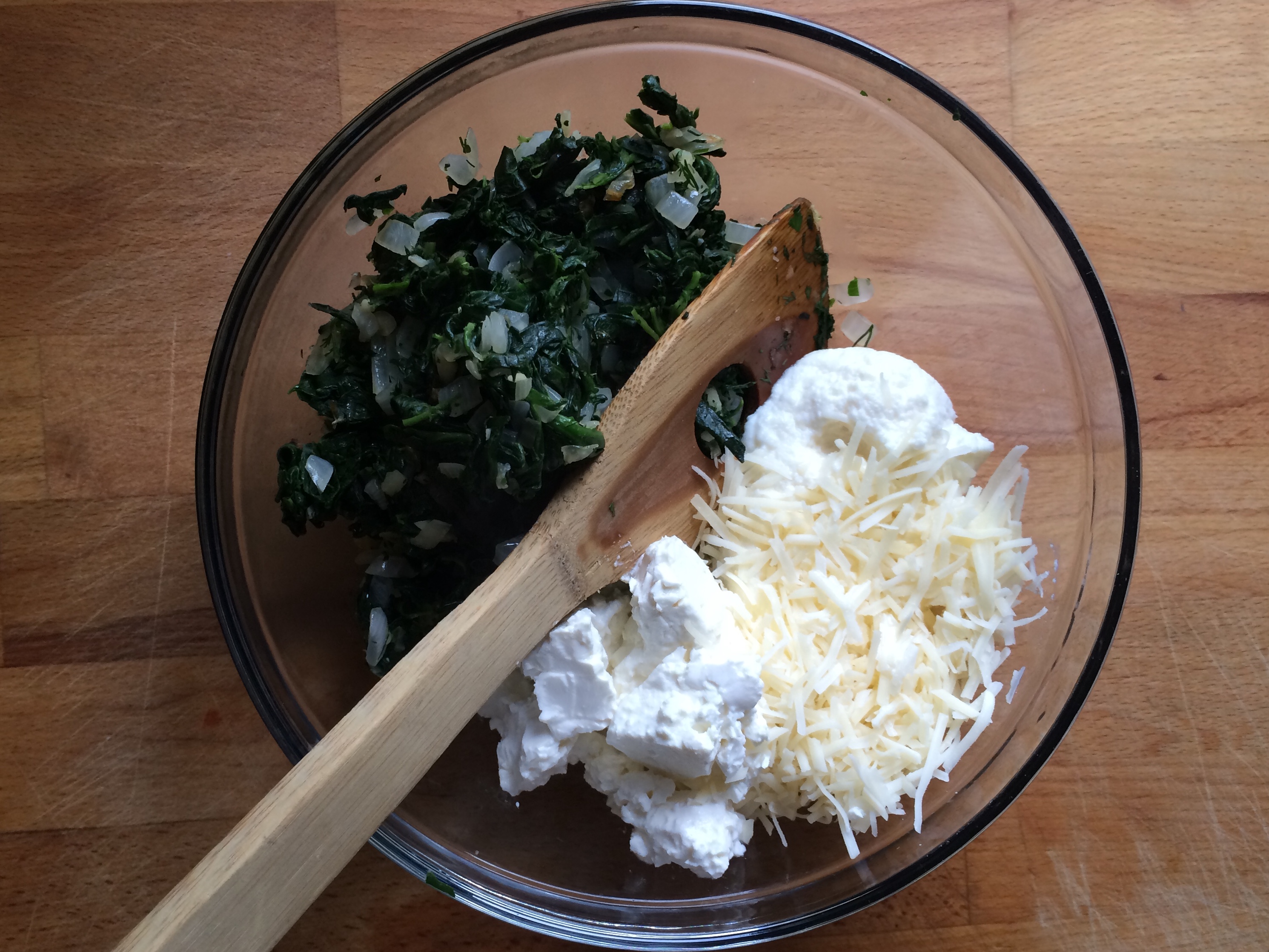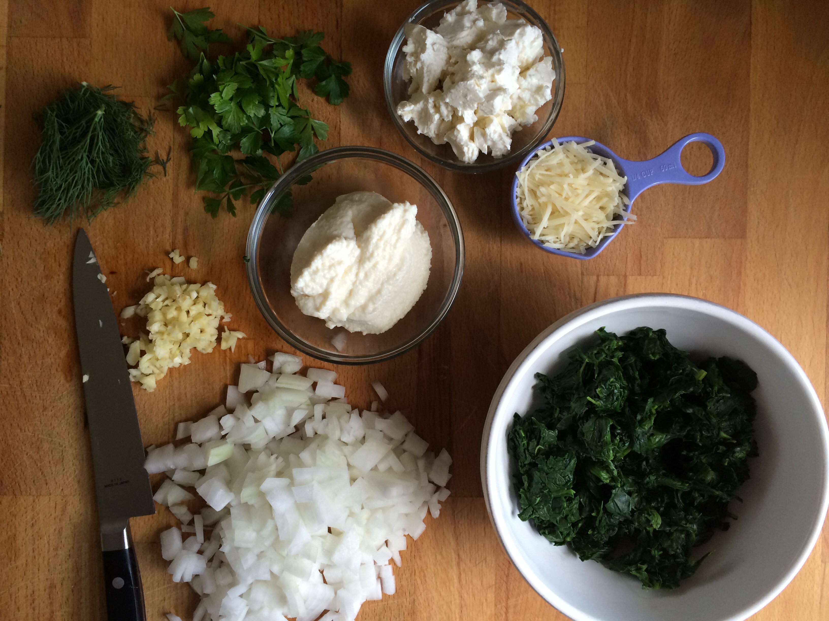 - Heat the olive oil in a saute pan over medium heat. Add onions and garlic and cook about 3 minute until onions become translucent. Add spinach, parsley, dill, 1/4 tsp kosher salt, freshly cracked black pepper, and cook until heated through. Remove from heat and allow to cool. Once cooled, mix in the feta, ricotta and parmesan cheese.