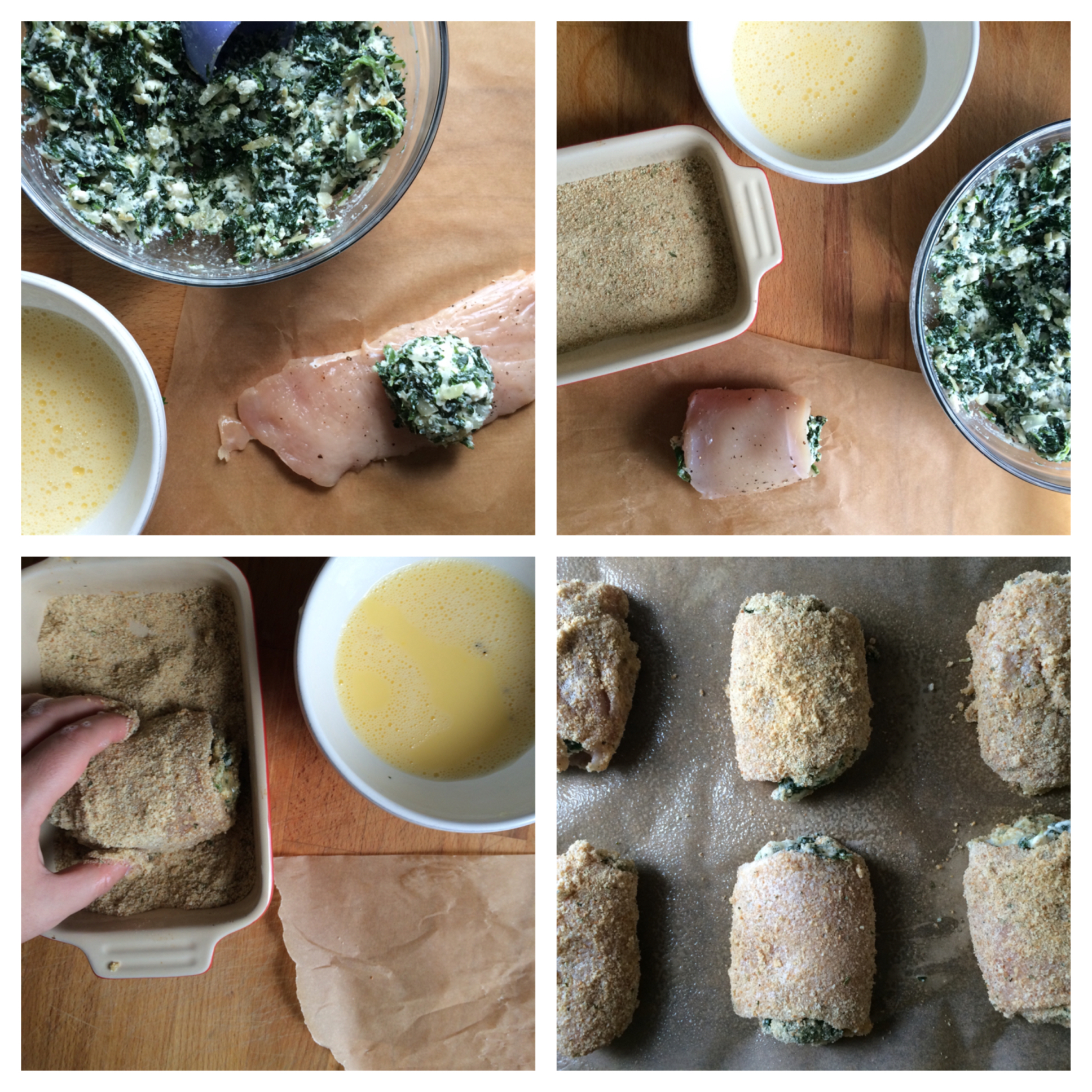 - Place about 1/3 cup of spinach mixture in the center of the chicken and roll tightly. Lay the chicken seam side down on a piece of parchment paper. Repeat with the remaining chicken.