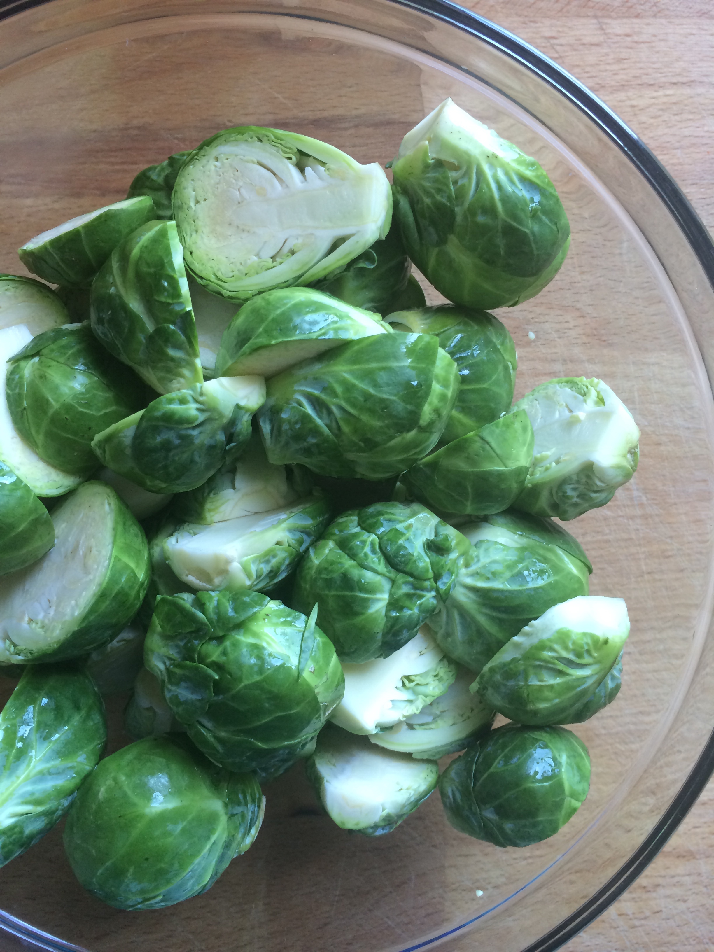 - Rinse Brussels sprouts under cold water and drain removing as much excess water as possible.