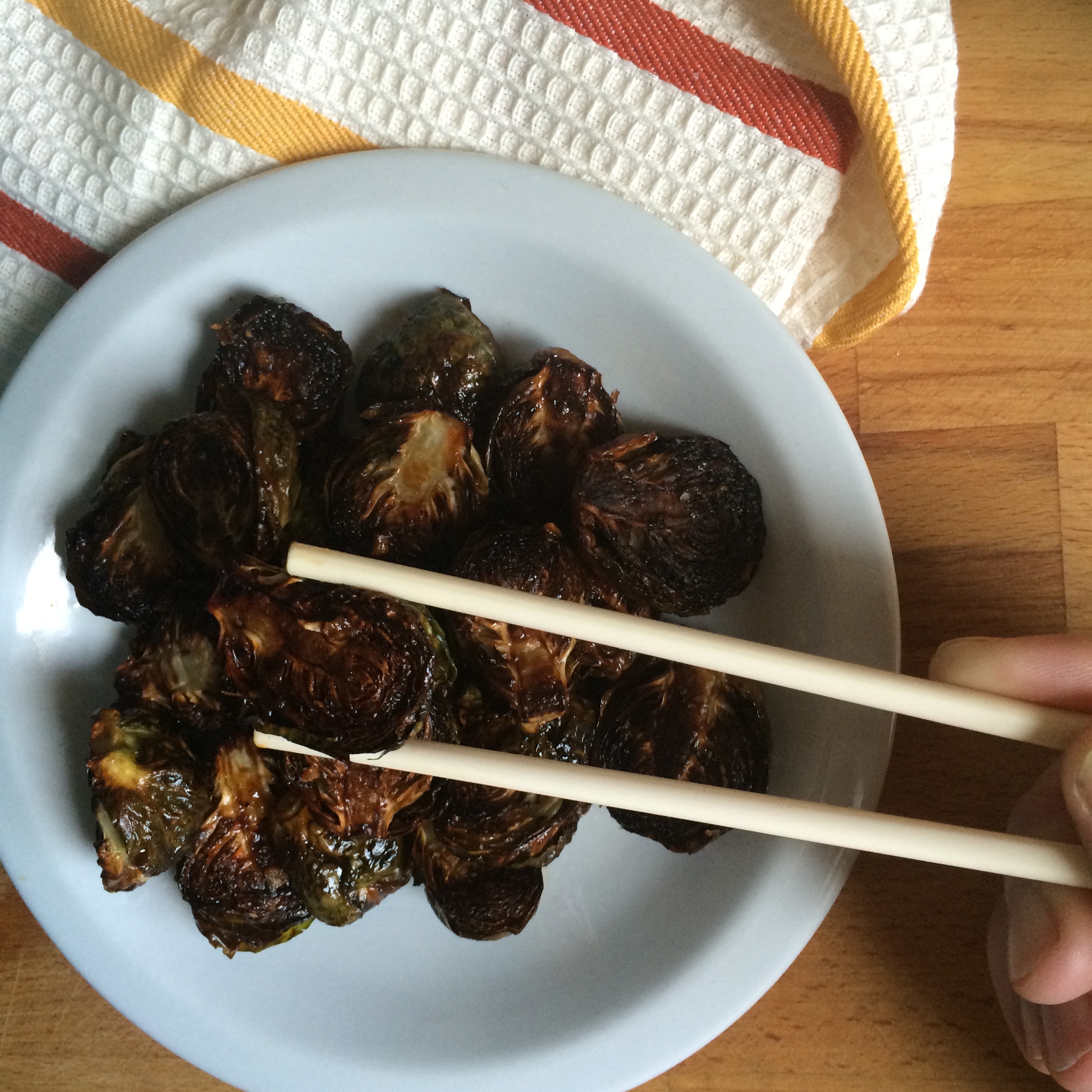 I crank the oven to high heat to get the Brussels sprouts charred and crispy, then toss them in a sticky Asian glaze. Slightly sweet, a bit tangy, and nicely balanced by the heat from the Sriracha.