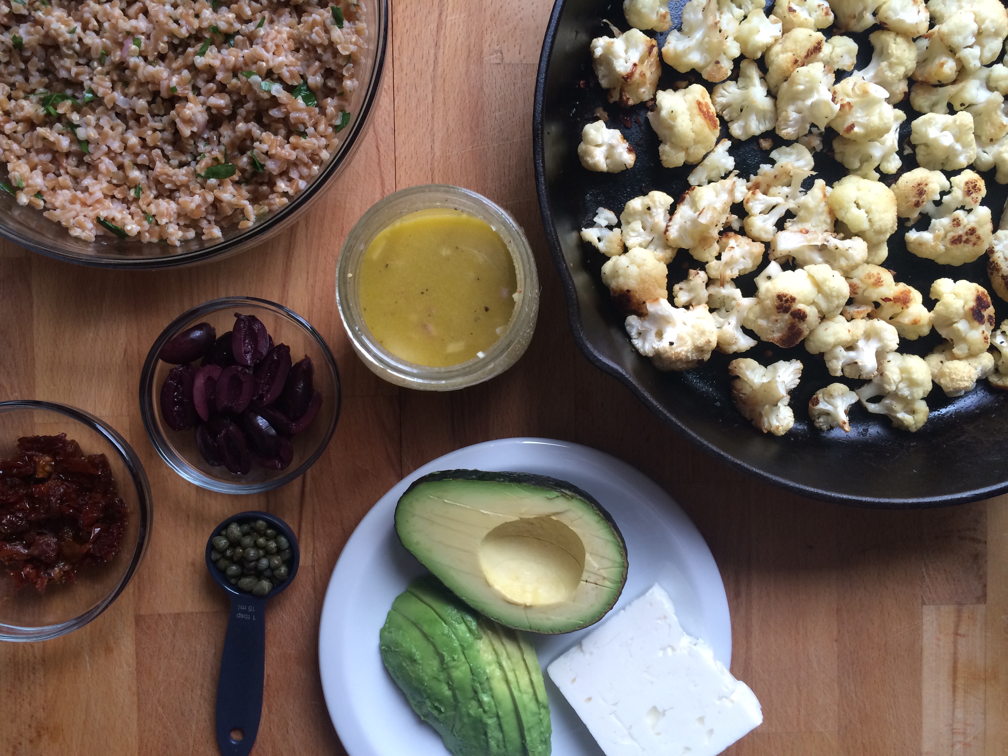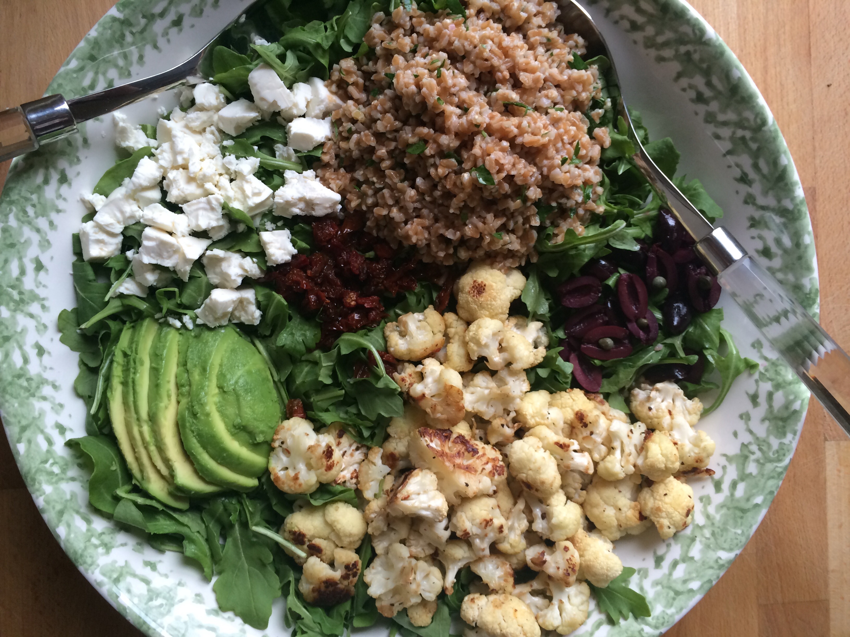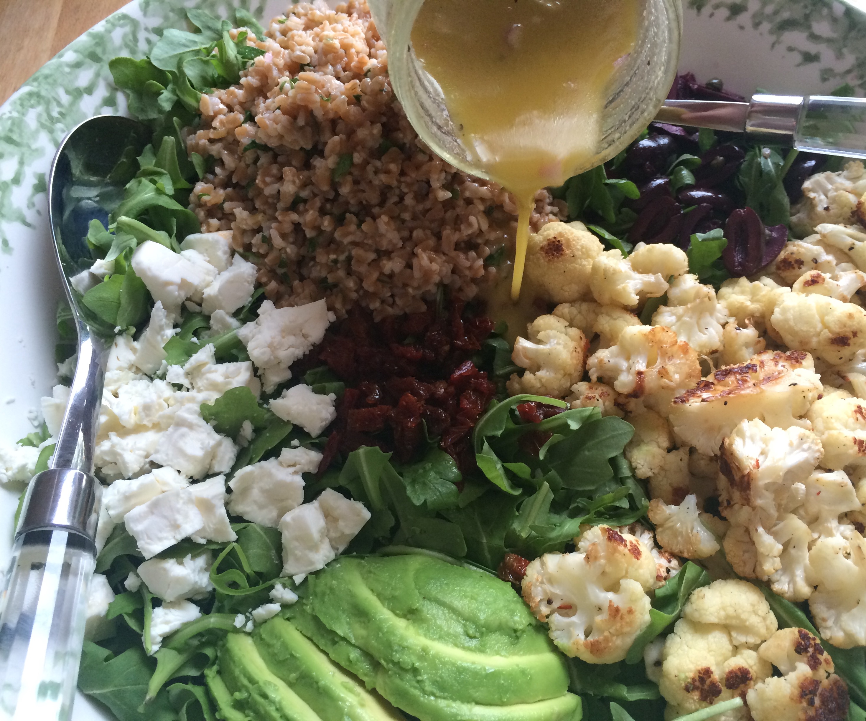 - In a large serving bowl, toss together arugula and 1/3 cup salad dressing. Add the roasted cauliflower, reserved farro, kalamata olives, sun-dried tomatoes, feta and capers.