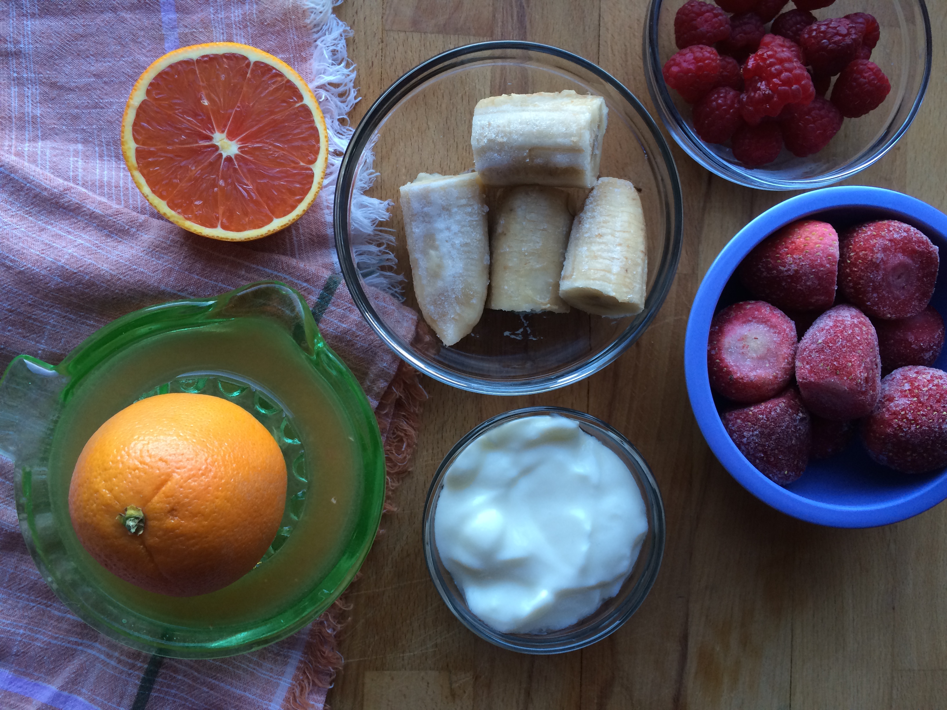 In addition to being low in calories and high in vitamin C, strawberries and raspberries are high in fiber. Banana adds a wonderful depth of flavor and an extra boost of potassium. Yogurt is added for a creamy texture and a bit of protein. Fresh orange juice gives the wonderfully subtle tang. Both fresh or frozen fruit can be used. I prefer frozen, adding a nice thickness. I adore this recipe. If you use all frozen fruits, you may need to add a bit of milk or water. If you use all fresh fruit, you may need to add a bit of ice.