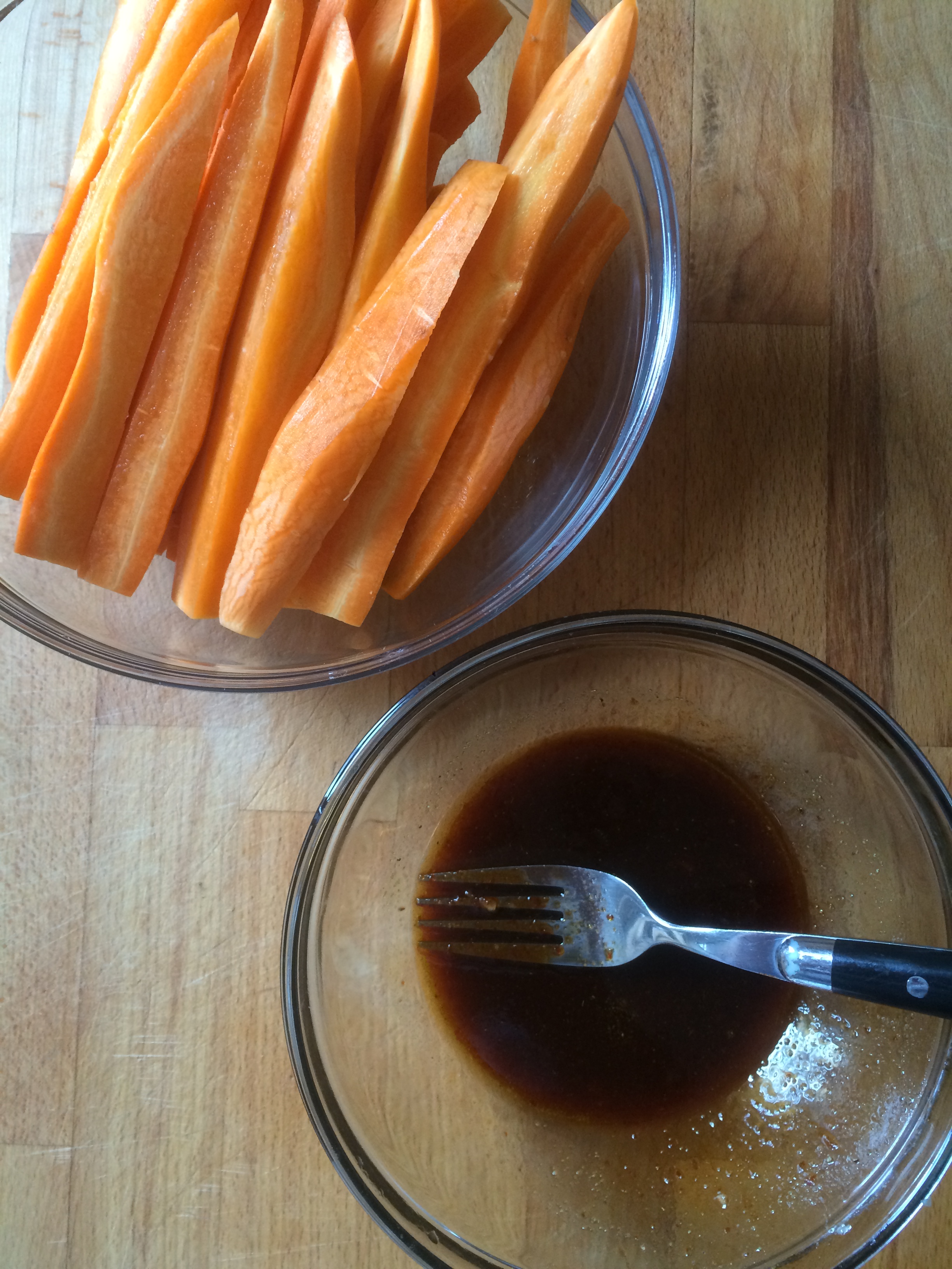 - Peel and trim off the ends of the carrots. Cut into quarters, first crosswise, then lengthwise.