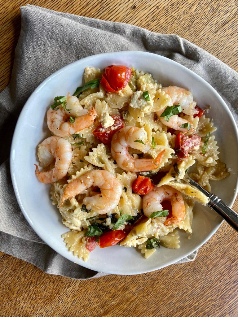 Drizzle shrimp with olive oil. Season with salt and pepper. Toss to coat. Add shrimp in a single layer to a sheet pan. During the last few minutes of baking the tomatoes and feta, add the shrimp to the oven and bake until shrimp turn pink and opaque (5-7 minutes). Squeeze lemon juice on top and sprinkle with whatever fresh herbs you have on hand (I prefer parsley). Top pasta with the baked shrimp.